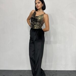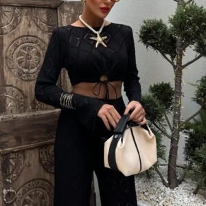 Göğüs Bağcık Detaylı Ajurlu Bluz Pantolon Takım 10098