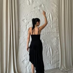 GÜLLÜ ELBİSE ASİMETRİK KATLI – Siyah