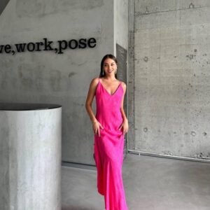 JAKARLI ASKILI SATEN ELBİSE ASİMETRİK – Pembe
