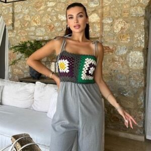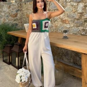 Kadın Askılı Kare Yakalı Arkadan Bağcıklı Desenli Keten Tulum