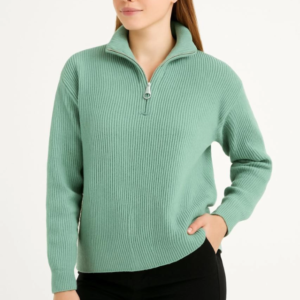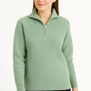 KADIN Yarım Fermuarlı Triko Kazak – Selanik Örgü, Dik Yaka, Pamuklu Dokuma, Oversize Uzun Kollu Kışlık Model – Mint Yeşili