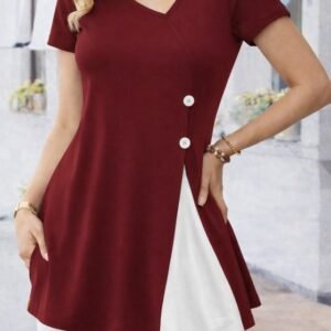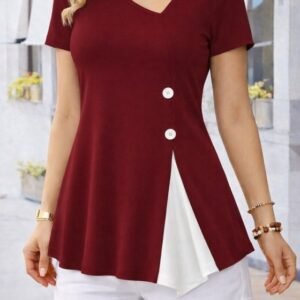 Kadın Kısa Kollu Asimetrik V Yakalı Düğme Detaylı Viskon Bluz