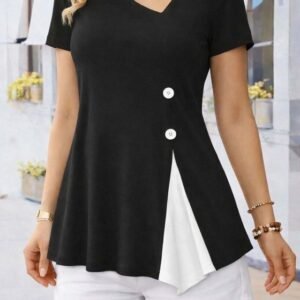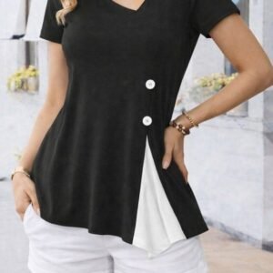 Kadın Kısa Kollu Asimetrik V Yakalı Düğme Detaylı Viskon Bluz