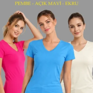 3lü V Yaka Tişört – Kısa Kollu Yazlık Slim Fit Body – Pembe, Açık Mavi, Ekru