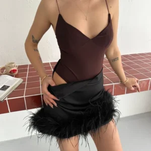 Derin Dekolte Askılı Body Sırt Dekolteli Şık Kolsuz Yazlık Bodysuit – Kahverengi