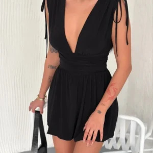 Derin V Yaka Etek Görünümlü Şortlu Elbise Drapeli Mini Yazlık – Siyah