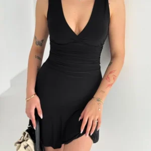 Derin V Yaka Sırt Dekolteli Mini Elbise Drapeli Şık Kolsuz – Siyah