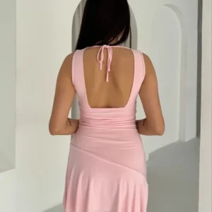 Derin V Yaka Sırt Dekolteli Mini Elbise Drapeli Şık Kolsuz – Pembe