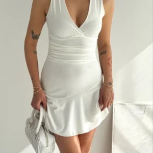 Derin V Yaka Sırt Dekolteli Mini Elbise Drapeli Şık Kolsuz – Beyaz