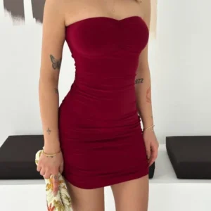 Drapeli Straplez Mini Elbise Esnek Kumaş Vücuda Oturan Gece Elbisesi – Bordo