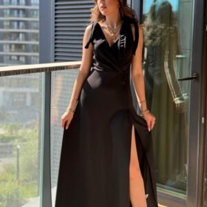 Kadın Askılı Omuzdan Bağlamalı Kruvaze Yakalı Uzun Yırtmaçlı Janjan Krep Elbise