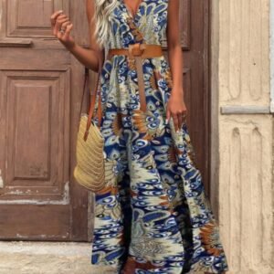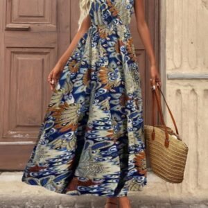 Kadın Askılı Kruvaze Yakalı Uzun Desenli Kemersiz Süprem Elbise