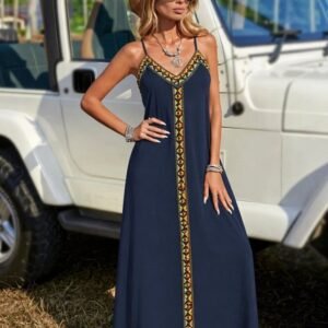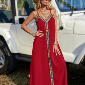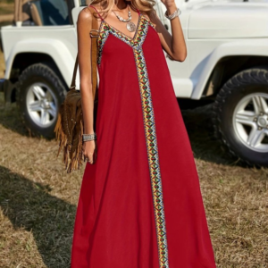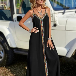 Kadın Askılı V Yakalı Etnik şerit Detaylı Uzun Viskon Elbise