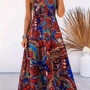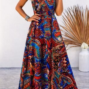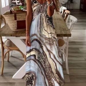 Kadın Askılı V Yakalı Desenlı Uzun Süprem Elbise