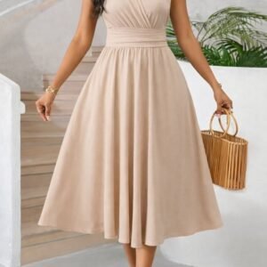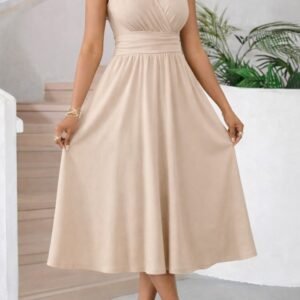 Kadın Askılı Kolsuz Belden Büzgülü Yırtmaçlı Midi Janjan Krep Elbise
