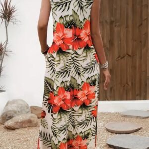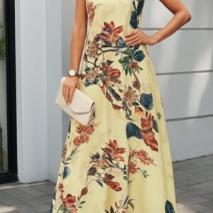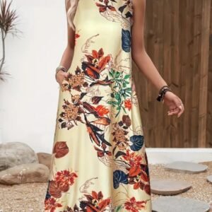 Kadın Askılı Yakası Fırfırlı Bağcıklı Desenli Uzun Süprem Elbise