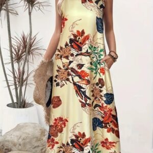 Kadın Askılı Yuvarlak Yaka Cepli Desenli Süprem Elbise