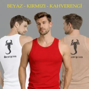 Erkek Spor Fitilli Atlet 3lü Set Beyaz, Kırmızı Ve Kahverengi Slim Fit Kaşkorse Arka Baskılı Spor Atlet
