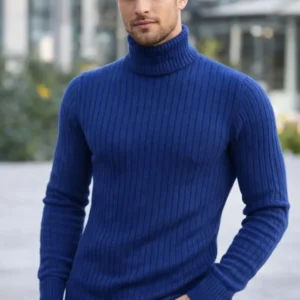 Erkek Balıkcı Yaka Bağazlı Triko Kazak Pamuklu Kalın Fitilli Dokuma, Regular Fit Uzun Kollu Kışlık Model – Saks Mavisi