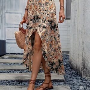 Kadın Yüksek Bel çiçek Desenli önü Asimetrik Detaylı Uzun Süprem Etek