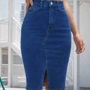 Kadın Yüksek Bel önden Yırtmaçlı Cepli Midi Kot Etek