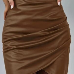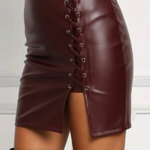 Kadın Yüksek Bel Yandan çapraz Bağcıklı Yırtmaçlı Mini Deri Etek