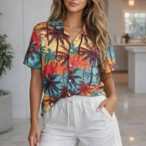 Tropikal Palmiye Desenli Gömlek Şort Takım Yazlık Rahat Kalıp – Desenli