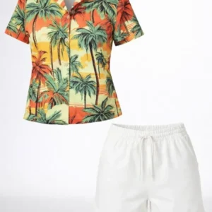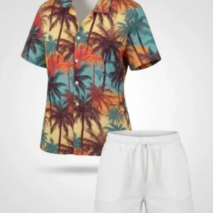 Tropikal Palmiye Desenli Kısa Kol Gömlek Şort Takım Yazlık Rahat – Desenli
