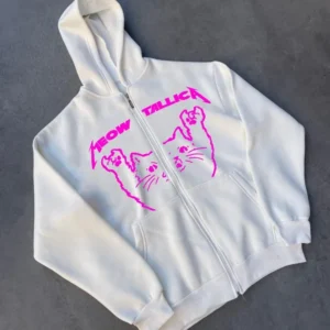 Kışlık Baskılı Fermuarlı Kapüşonlu Hırka – Beyaz