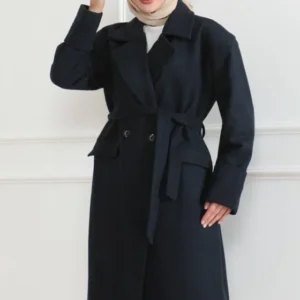 Kaşe Kaban Uzun Boy Kruvaze Yaka Kuşaklı Tesettür Kaşe Kaban Astarlı – Lacivert