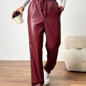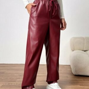 Kadın Yüksel Bel Bağcıklı Deri Pantolon