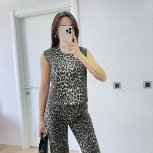 Leopar Desenli Düğmeli Bluzlu Pantolon İkili Takım -Leopar