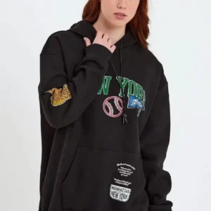 Baskılı Oversize Üç İplik Kapüşonlu Sweatshirt – Siyah