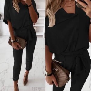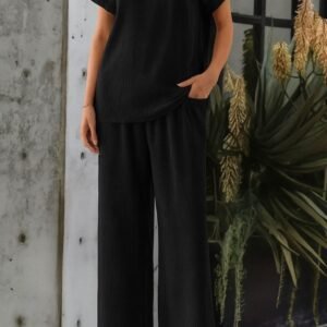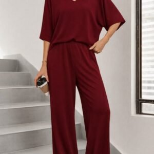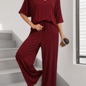 Kadın Kısa Kollu V Yakalı Viskon Iki Iplik Bluz Ve Pantolon Ikili Takım