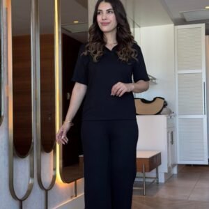 Kadın Kısa Kollu Yakalı Viskon Iki Iplik Bluz Ve Pantolon Ikili Takım