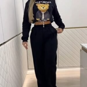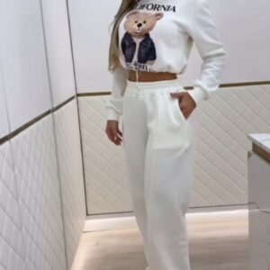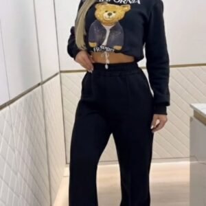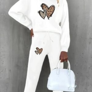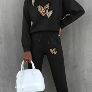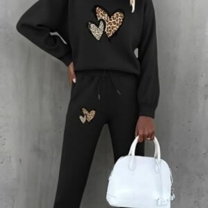 Kadın Uzun Kollu Bisiklet Yaka Kalp Desenli şardonlu üç Iplik Bluz Ve Pantolon Ikili Takım