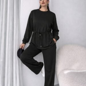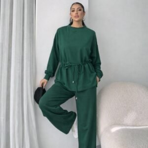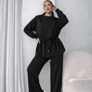Kadın Uzun Kollu Bisiklet Yaka Belden Büzgülü Bağcıklı Viskon Iki Iplik Bluz Ve Pantolon Ikili Takım