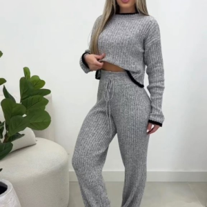 Kadın Uzun Kollu Bisiklet Yaka Kısa Trıko Bluz Ve Pantolon Ikili Takım