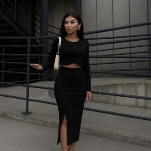 Kadın Uzun Kollu Bisiklet Yaka Kısa Krop Dalgıç Bluz Ile önden Yırtmaçlı Uzun Etek Ikili Takım