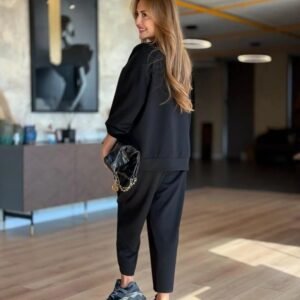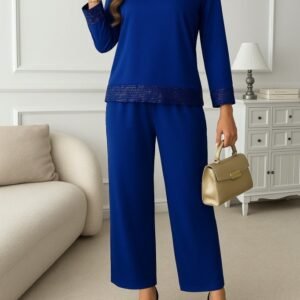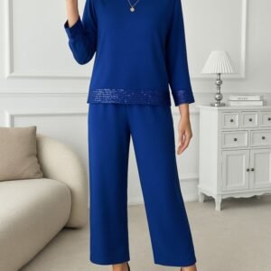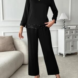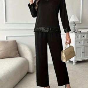 Kadın Uzun Kollu Bisiklet Yaka Pulpayetli Viskon Iki Iplik Bluz Ve Pantolon Ikili Takım