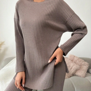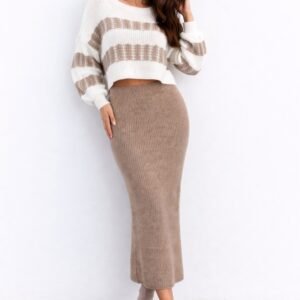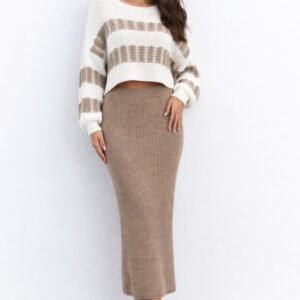 Kadın Uzun Kollu Kayık Yakalı Salaş Triko Bluz Ve Etek Ikili Takım