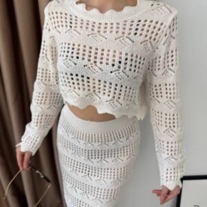 Kadın Uzun Kollu Kuş Gözü Transparan Detay Triko Bluz Ve Maxi Boy Etek Ikili Takım