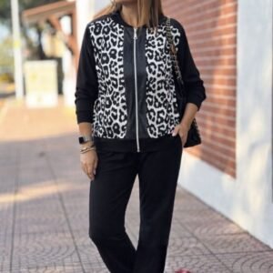 Kadın Uzun Kollu önden Fermuarlı Leopar Desenli Viskon Iki Iplik Bluz Ve Pantolon Ikili Takım