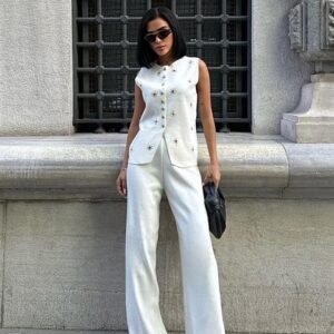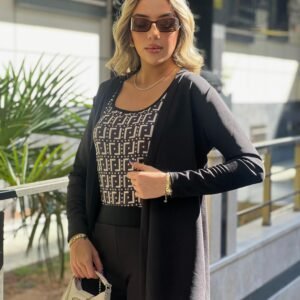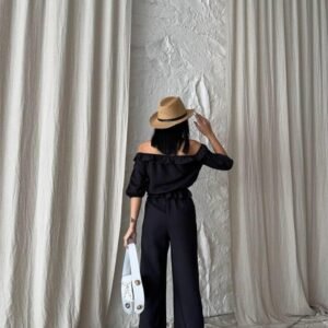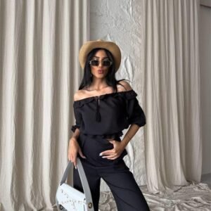 KETEN MADONNA YAKA KOL HASIR ŞERİT – PANTOLON TAKIM – Siyah