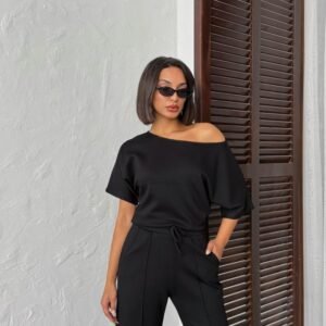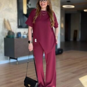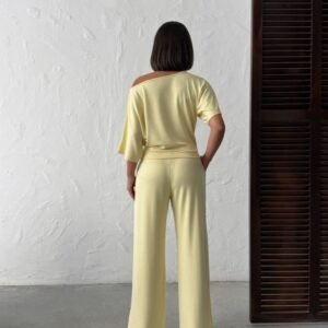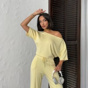 Kadın Kısa Kollu Bisiklet Yaka Asimetrik Viskon Iki Iplik Bluz Ve Pantolon Ikili Takım