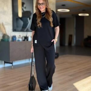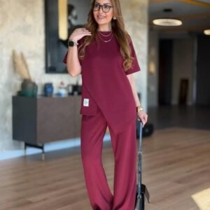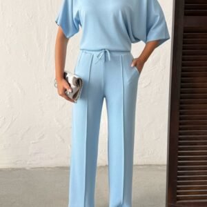 Kadın İsa Kollu Kayık Yaka Bluz Ve Pantolon Misal Kumaş Ikili Takım