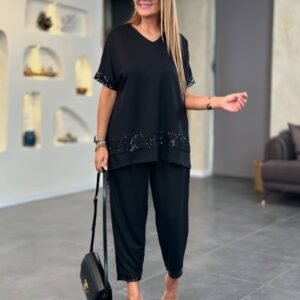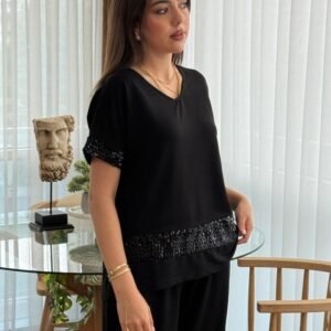 Kadın Kısa Kollu V Yakalı Pul Payetli Viskon Iki Iplik Bluz Ve Pantolon Ikili Takım