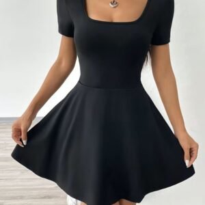 Kadın Kısa Kollu Kare Yakalı Cep Detaylı Dalgıç Elbise Tulum