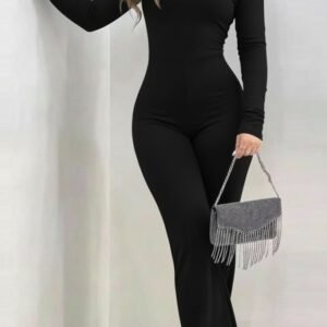 Kadın Tek Omuzdan Açık Balıkçı Yaka Taş Detaylı Uzun Ithal Krep Tulum