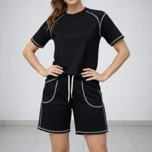 Spor Tişört Şort Takım Kontrast Dikiş Detaylı Ovarsize Rahat Kalıp – Siyah